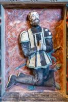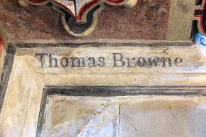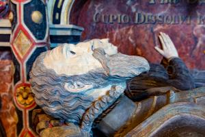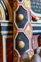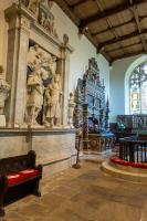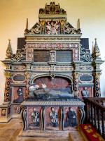 After 1604. Monument to William Bellasis of Newburgh Priory in Yorkshire (deceased) and his wife Margaret Fairfax at St Michael's Church, Coxwold, North Yorkshire [Map]. Recumbent effigies in large classical entablature with painted strapwork, coats of arms and Latin texts, carved by Thomas Browne from Hazlewood stone.