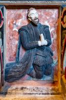 After 1653. Monument to Thomas Belasyse 1st Viscount Fauconberg (age 76) and his wife Barbara Cholmley on south wall of Chancel at St Michael's Church, Coxwold, North Yorkshire [Map]. Two kneeling figures in large aedicule with Corinthian columns.