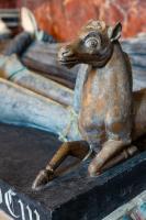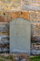 After 1768. Porch of St Michael's Church, Coxwold, North Yorkshire [Map]. The original gravestone of Laurence Sterne (age 54) with a rhyming epitaph erected by a group of Freemasons erected near to his original burial place, and his new gravestone.