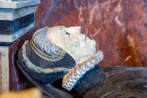 After 1700. Monument to Henry Belasyse and his son Thomas Belasyse 1st Earl Fauconberg (age 73) at St Michael's Church, Coxwold, North Yorkshire [Map]. Sculpted by John Nost. White marble life-size figures with putti above bearing an earl's coronet.