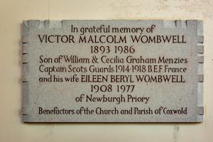After 1986. Memorial to Captain Victor Malcolm Wombwell (age 92) and his wife Eileen Beryl Tilley at St Michael's Church, Coxwold, North Yorkshire [Map].