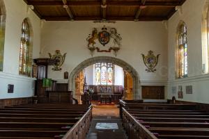 Chancel of St Michael's Church, Coxwold, North Yorkshire [Map] with its unusual eighteenth century altar rail of turned balusters projecting forward in u-shaped plan between the monuments, and monuments.