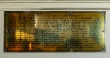 After 1901. Windows dedicated to Stephen Frederick Wombwell (deceased) at St Michael's Church, Coxwold, North Yorkshire [Map] by "a few of his friends" including The Marquis Camden (age 28), The Viscount Castlereagh (age 22), Richard Frederick Cavendish (age 29), Victor Christian William Cavendish 9th Duke Devonshire (age 32), Maharaja Duleep Singh, Edward Grenfell 1st Baron St Just (age 30), Ivor Churchill Guest 1st Viscount Wimborne (age 27), The Viscount Helmsley (age 21), The Duke of Marlborough (age 29).