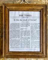 On 22nd March 1768 Laurence Sterne (deceased) was buried in the churchyard of St George's Church, Hanover Square. It was widely rumoured that Sterne's body was stolen shortly after it was interred and sold to anatomists at Cambridge University. Circumstantially, it was said that his body was recognised by Charles Collignon, who knew him, and discreetly reinterred back in St George's, in an unknown plot. When the churchyard of St. George's was redeveloped in 1969, amongst 11,500 skulls disinterred, several were identified with drastic cuts from anatomising or a post-mortem examination. One was identified to be of a size that matched a bust of Sterne made by Nollekens. His remains were transferred to Coxwold churchyard [Map] in 1969 by the Laurence Sterne Trust.
