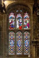 Archaeologia Volume 9 Appendix. 22nd May 1788. Owen Salusbury Brereton (age 73), Esq. V. P. exhibited a beautiful coloured drawing of a window in the parish-church of Brereton [Map], one of the oldest in the county-palatine of Chester; but the date of it is not exactly known1. In the lower compartments are four figures representing the four persons who slew Thomas Becket at the high altar in Canterbury cathedral, 1170. They are in complete armour, with drawn swords in their hands, and on pendant scrolls are inscribed their names; William Tracy, Richard Britton, Reginald Fitzurse, and Hugh Morrel. A fifth figure, exactly correiponding with these, in the centre compartments, bears, on the like scroll, these words, Martyrum Thomam. In three compartments of the Upper division of the window are two priests [Note. In the original the word priests is crossed out, and the word "saints" written in the margin.], and between them a figure episcopally habited, most probably intended for Becket himself. Under the five lower figures, after their names are these words tended for two hexameter lines: