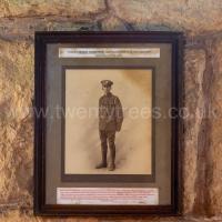 1918. St Peter's Church, Chillingham [Map]. Memorial to Samuel Sanderson of the Northumberland Fusiliers who was killed in the First World War. The note at the bottom reads ... Sam went to the Village School, just beyond the ford, and was just seventeen when he was killed. Sam's father, his brother and his nephew each served as Head Gardener to the Castle [Map], as Sam surely would have done had he lived. Sam and his parents lived in the Castle East Lodge, just by this Church as did Sam's nephew, *Alan, whose sister was born in the East Lodge. *Alan restored the Castle Garden from ruin and only retired in 2012, the last of a long line of Saunderson Gardeners, maybe dating back to the 1500s. One 1500s ledger reads: "Alexander the Gardener Holdeth one Cottage at three shillings per year." Alexander's son would have been Alexanderson. Sam, Rest in Peace.