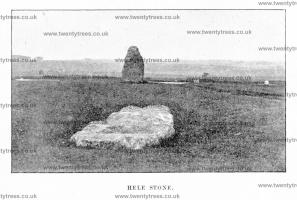 A Sentimental Guide to Stonehenge by Lady Antrobus. As to the kinds of stone actually employed in the building of Stonehenge, the whole of the outer circle and the four stones lying beyond that circle are undoubtedly "Sarsen" (which are the boulder stones left by the ice-sheet of the glacial period on the Wiltshire downs). There are, in the inner circle, four stones which have been called "horn-stone." The remainder are "diabase," commonly called "bluestones," and similar are found in Wales, and in parts of Cumberland and Cornwall, the so-called Altar Stone being a kind of grey sandstone, not sarsen. The large outlying stone, known traditionally as the "Friar's Heel [Map]," from a legend that when the devil was busy erecting Stonehenge he made the observation that no one would ever know how it was done. This was overheard by a friar p. 28lurking near by, and he incautiously replied in the Wiltshire dialect, "That's more than thee can tell," and fled for his life; the devil, catching up an odd stone, flung it after the friar, and hit him on the heel. This stone is also named the "Pointer," because from the middle of the Altar Stone the sun is seen at the summer solstice (21st of June) to rise immediately above it. The Hele Stone is the true name, "Hele" meaning "to hide," from Heol or Haul of Geol or Jul, all names for the sun, which this stone seems to hide. From the Friar's Heel it is about 66 yards to a low circular earthen boundary, enclosing the area within which Stonehenge stands. Just within the entrance to this earthen ring lies a large prostrate stone called the "Slaughter Stone," supposed by some to have been used for the slaughter of victims about to be offered in sacrifice at the altar. The Slaughter Stone (at the end nearest to the Friar's Heel) bears evidence of tool-marks, there being six small round cavities made in it by blows from a flint tool. On the margin of the earthen ring, one 55 yards on the left, the other 95 yards on the right of the entrance, are two small, unhewn stones.