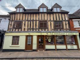 Market Street, Uttoxeter. Butcher T G Sargeant and Sons located in a Tudor building.