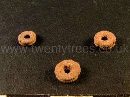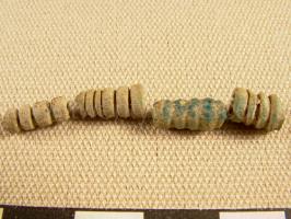 Wiltshire Museum. DZSWS:STHEAD.68. 18 clay beads (48 originally discovered) found in a primary deposit (no inhumation) in (confluent) bowl barrow Winterbourne Stoke G64a [Map] (i), excavated by William Cunnington.