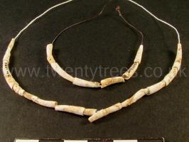 Wiltshire Museum. DZSWS:STHEAD.69. 22 fossil dentalium beads found in a primary deposit (no inhumation) in (confluent) bowl barrow Winterbourne Stoke G64a [Map] (i), excavated by William Cunnington.