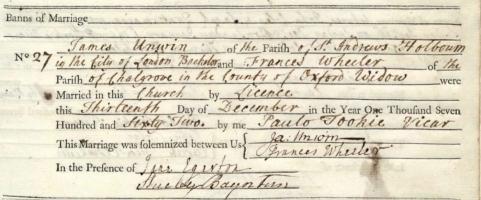 On 13th December 1762 James Unwin (age 45) and Frances Wheeler (age 36) were married.