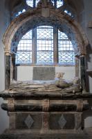 Elaborate canopied Stuart Hooded Monument of alabaster, the effigies one above the other, with the figures of four sons and five daughters below. The canopy is supported by bedesmen in black gowns, and is surmounted by figures of Faith, Hope, and Charity. Above is an inscribed panel surrounded by books on end and various linked symbols with winged cherubs above. Large caryatids representing hooded bedesmen to left and right. Arch above with 3 standing figures and 2 hour-glasses on sculls.