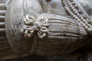 After 31st October 1612. Church of St Peter and St Paul, Easton Maudit [Map]. Monument to Christopher Yelverton (deceased) and Margaret Catesby was buried at Church of St Peter and St Paul, Easton Maudit [Map]. Early canopied Stuart Hooded Monument with eight daughters shown on one side, four sons on the other. The posts support a canopy of two semicircular arches with coffered soffits, urn ornaments at the angles, and shields of arms.