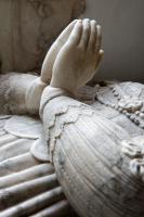 On 14th November 1627 Elizabeth Waldegrave died. On 6th December 1629 Arthur Coke (age 40) died in Bury St Edmunds, Suffolk [Map]. Stuart Hooded Monument sculpted by Nicholas Stone (age 40) in St Andrew's Church, Bramfield [Map]. White and black marble; reclining effigy of Elizabeth with Arthur kneeling in prayer above within an arched Recess; Arms over the arch and surrounding it are seven Cartouche's.