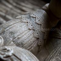 In 4th March 1606 Edward Fitton (age 58) died. On 5th February 1627 Alice Holcroft (age 66) died. Monument at Church of St James, Gawsworth [Map]. The monument originally stood against the east wall, away from the north wall, with the kneeling figures of the children at each corner. Sir Edward's effigy is lost and there is no record when it was last in situ at Gawsworth. Note the remodelled head of the second son, Richard.