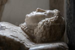On 24th May 1616 Margaret Russell Countess Cumberland (age 55) died at Brougham Castle [Map]. She was buried in St Lawrence's Church, Appleby-in-Westmoreland [Map]. Finely carved alabaster. Stuart Hooded Monument, Shroud Monument, with Coronet. By Maximilian Colt (age 41).