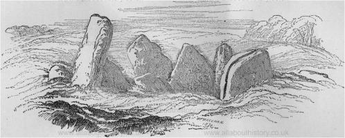 Handbook of Irish Antiquities by Wakeman Chapter 1. Knockmany Chamber [Map]. This interesting sepulchral monument, which is illustrated in the frontispiece to this work, is on the summit of a wooded hill, about76 two and a half miles north of Clogher, County Tyrone. The chamber is of the type known as the 'giant's grave'; it lies nearly due north and south, and consists of thirteen stones, most of which are mill-stone grit. None of the covering stones now remain, having probably been removed for building purposes. The tomb seems to have been originally covered by a mound. The internal measurement is 10 feet 3 inches by 6 feet 6 inches; two of the blocks of the east side have fallen inwards. Four of the stones have markings, consisting of cup-hollows, zigzag lines, concentric circles, and other curved patterns. Expert opinion, from an examination of their forms, is inclined to associate the markings with the later Bronze Age of Scandinavia, and to give a probable date of this sepulchral chamber as 500 B.C. The tomb is known locally as 'Aynia's Cove,' popular superstition associating it with a witch or hag named Aynia or Ainé. It is also called Knoc Baine, as being the supposed burial-place of Baine, mother of Feidhlimidh Reachtmhar, who was king of Ireland early in the second century. This would bring the monument to the Late Celtic period, which is difficult to reconcile with the archæological evidence already mentioned, associating it with the Bronze Age.35