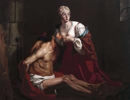 1645. Gaspar de Crayer (age 60). "Caritas Romana". The scene depicted in the painting is set in Cimon's cell. Cimon, who occupies the center of the painting, is sitting with his hands tied and bound to the wall behind him, suckling at his daughter's breast. Pero is standing over her father, with her arm around his shoulder and her hand gently posed on his back.