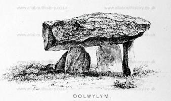Archaeologia Cambrensis 1872 Pages 81-143. One ot the most perfect and interesting dolmens [Gwal y Filiast Burial Chamber [Map]] in Wales stands in the grounds of Dolwilym, in the northern extremity of the parish of Llanboidy, in Carmarthen-shire. The spot in which it is placed commands a singularly picturesque view of the vale and river of Taf, and is about midway down the steep slope on the right side of the river. Originally the chamber consisted of five or rather six stones, although only four now remain. The fifth, now missing, filled up the empty space at the south-west angle; and in all probability there was a second small stone at the eastern end, as the one now there could not, from its shortness, have closed that entrance. The western side is formed of one large stone on which the capstone rests; whence it is certain that the entrance was not here, but at the opposite end, towards which also the capstone gradually inclines. The upright stone at the eastern end is only about 2 ft. high; that at the opposite extremity being 4 ft. 4 ins.,—a difference that would not be expected from the almost horizontal position of the capstone. Sir Gardner Wilkinson gives the length and breadth, 11 ft. 6 ins. and 8 ft. 10 ins. Another measurement, taken diagonally, gave the two diagonals, 11 and 10 ft. There are several scattered stones lying about, all probablyconnected with the chamber and mound; of which last, however, hardly any traces remain. There are in all thirty-two stones within the circle; but the exact position, on account of the long and wet grass, was not ascertained with any accuracy of detail on the occasion of its being examined; but at any rate there are the remains of the circle of Isolated stones which constantly surrounded the base of the tumulus, at, some little distance from it. It has two names according to E. Davies, the author of the well known volumes on Celtic antiquities and Druids, one of Which is Burdd Arthur (Arthur's table), and the other, Gwâl y Vilast (the couch of the greyhound bitch). Of this animal there are many records scattered over Wales, Thus Ffynnon Milgi, in Llanelidan parish, in Denbighshire, is one instance. The inner sides of the upright stones are smooth and regular, while the lower face of the capstone, contrary to the more usual practice, is extremely rough and rugged. Near it is what is known as Crochan Arthur.