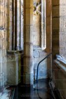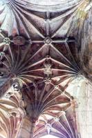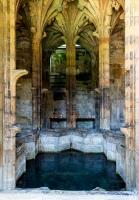 The spring rises from a bed of shingle at the foot of a steep hill, the water rushing out with great impetuosity, and flowing into and over the main basin into a smaller one in front. The well is enclosed by a building in the perpendicular Gothic style (dating from the beginning of the reign of Henry VII), which forms a crypt under a small chapel contiguous to the parish church, and on a level with it; the entmnce to the well being by descent of about twenty steps from the street. The well itself is a star-shaped basin, ten feet in diameter, canopied by a most graceful stellar vault, and originally enclosed by stone traceried screens filling up the spaces between the supports. Round the basin is an ambulatory similarly vaulted.1 The sculptural ornaments consisted of grotesque animals, and the armorial-bearings of various benefactors of the shrine; among them being Catharine of Aragon, Margaret, mother of Henry II, and different members of the Stanley family, the founder both of the crypt and the chapel above it. Formerly, the former contained statues of the Virgin Mary and St Winifred. The first was removed in 1635; the fate of Winifred's to which a Countess of Warwick (1439) bequeathed her ruset velvet gown, is unknown. On the stones at the bottom of the well grow Bissus iolethus, and a species of red Jungermania moss in the vulgar tongue as Winifred's hair an blood. In the seventeenth century St Winifred could boast thousands of votaries.